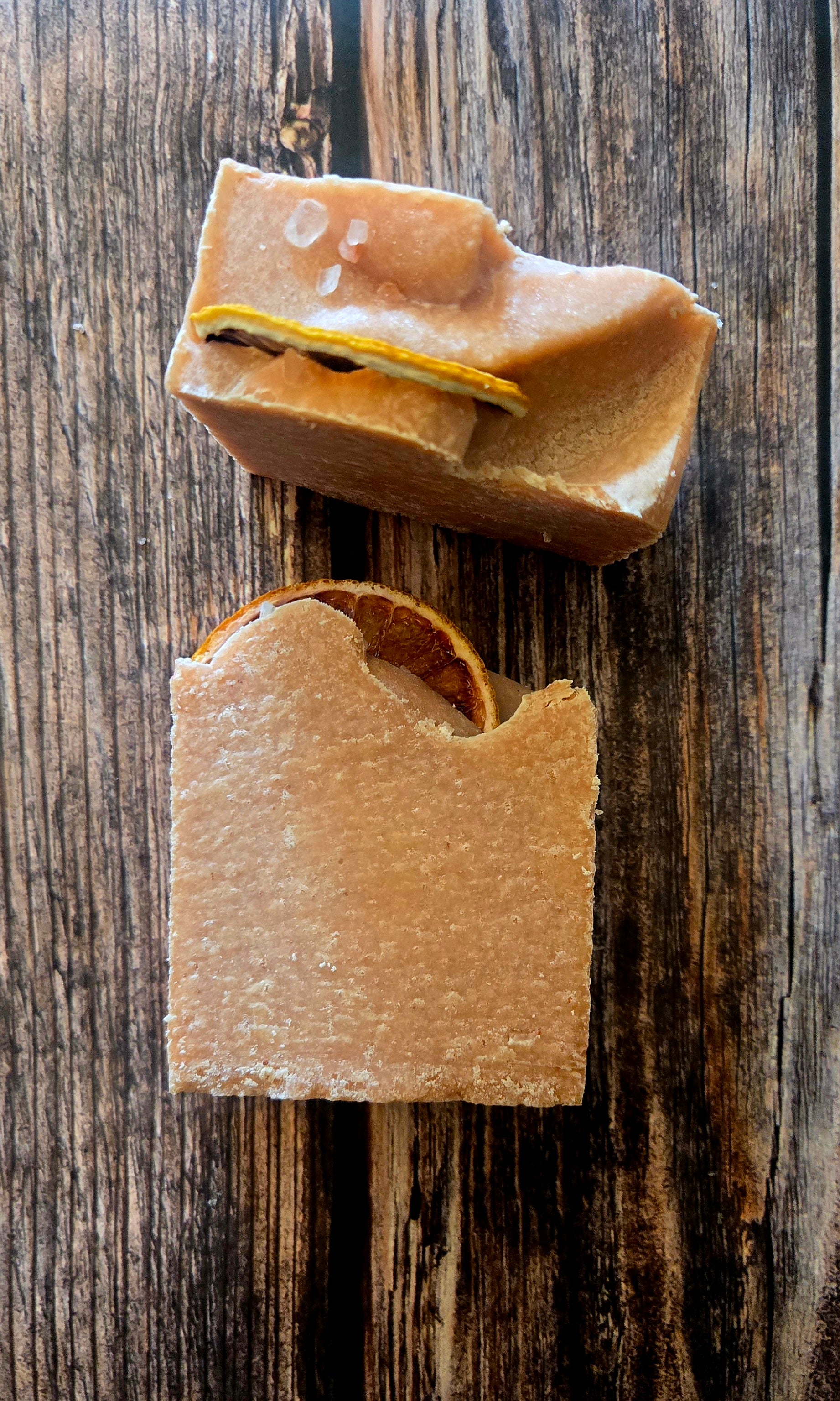 Ingredients: Saponified coconut oil, cocoa butter, castor oil, mineral Sea Salt, red moroccan clay, orange, lemon essential oils, dried lemon slices